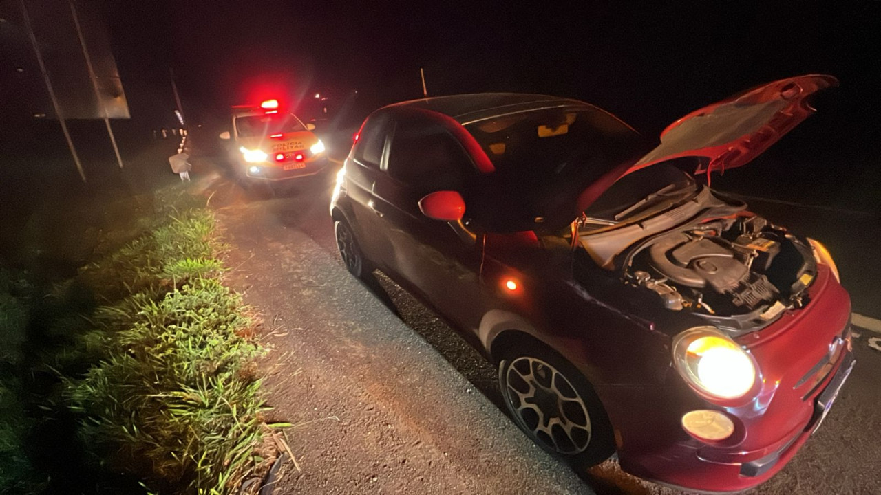 Segundo o Policiamento Rodoviário, a equipe realizava patrulhamento ostensivo no sentido oeste quando, na altura do km 263, visualizou um veículo trafegando lentamente, com o pisca-alerta ligado e apresentando avarias no para-choque dianteiro, além de danos no pneu e na roda dianteira direita.
