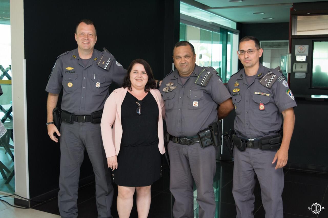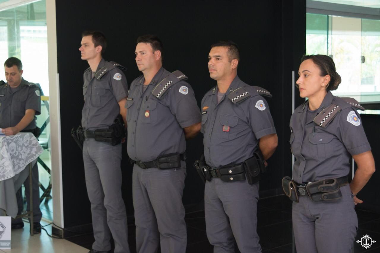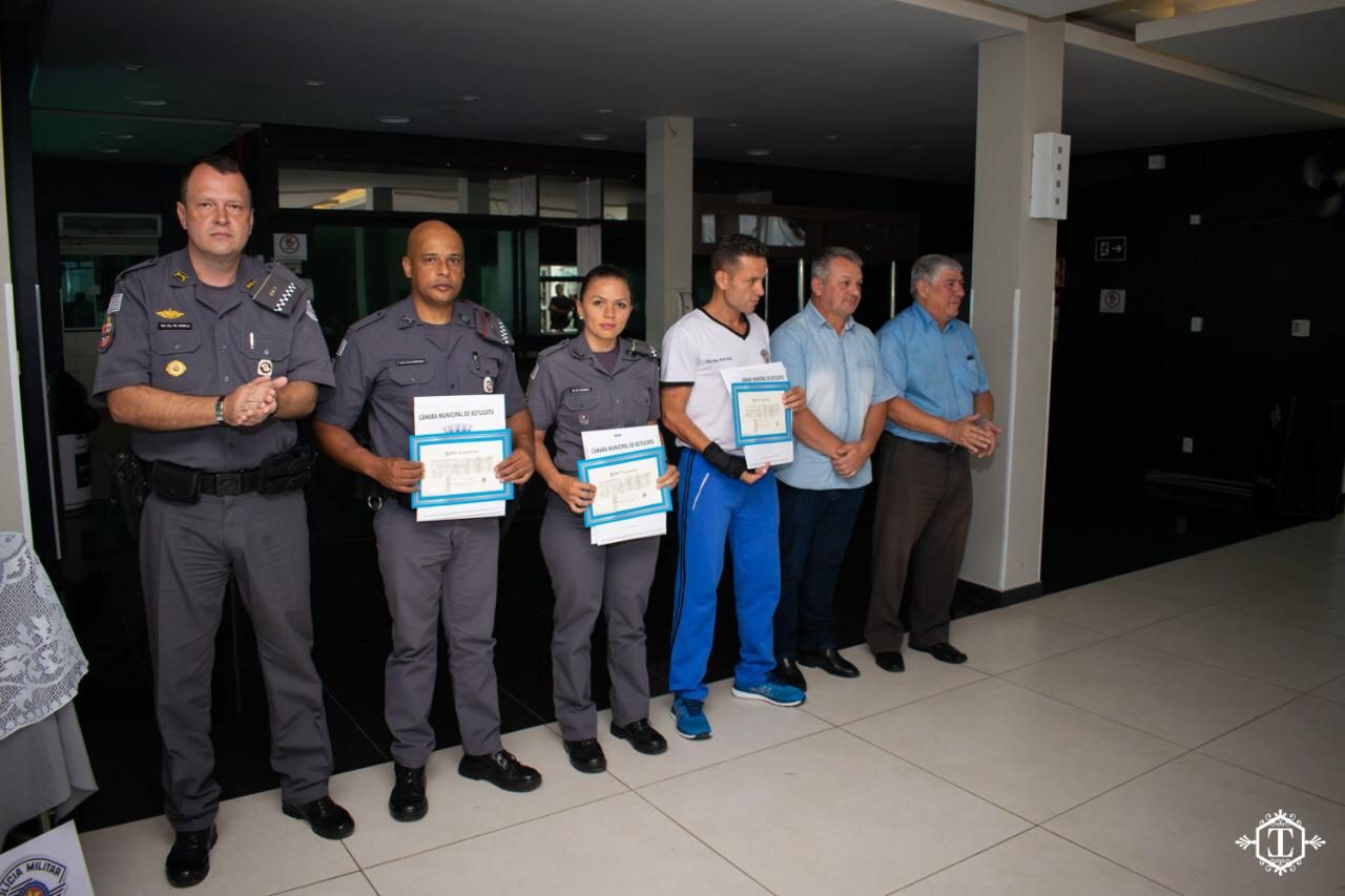 Os policiais militares 1º Sargento PM Domingos, Cabo PM Daniele e Cabo PM Rafael, receberam das mãos do Vereador Sargento Laudo a Moção de Gratulações da Câmara de Botucatu.