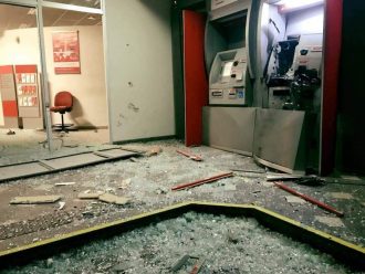 Na ação, a porta de vidro do banco Santander ficou totalmente destruída. Os caixas eletrônicos também ficaram danificados.