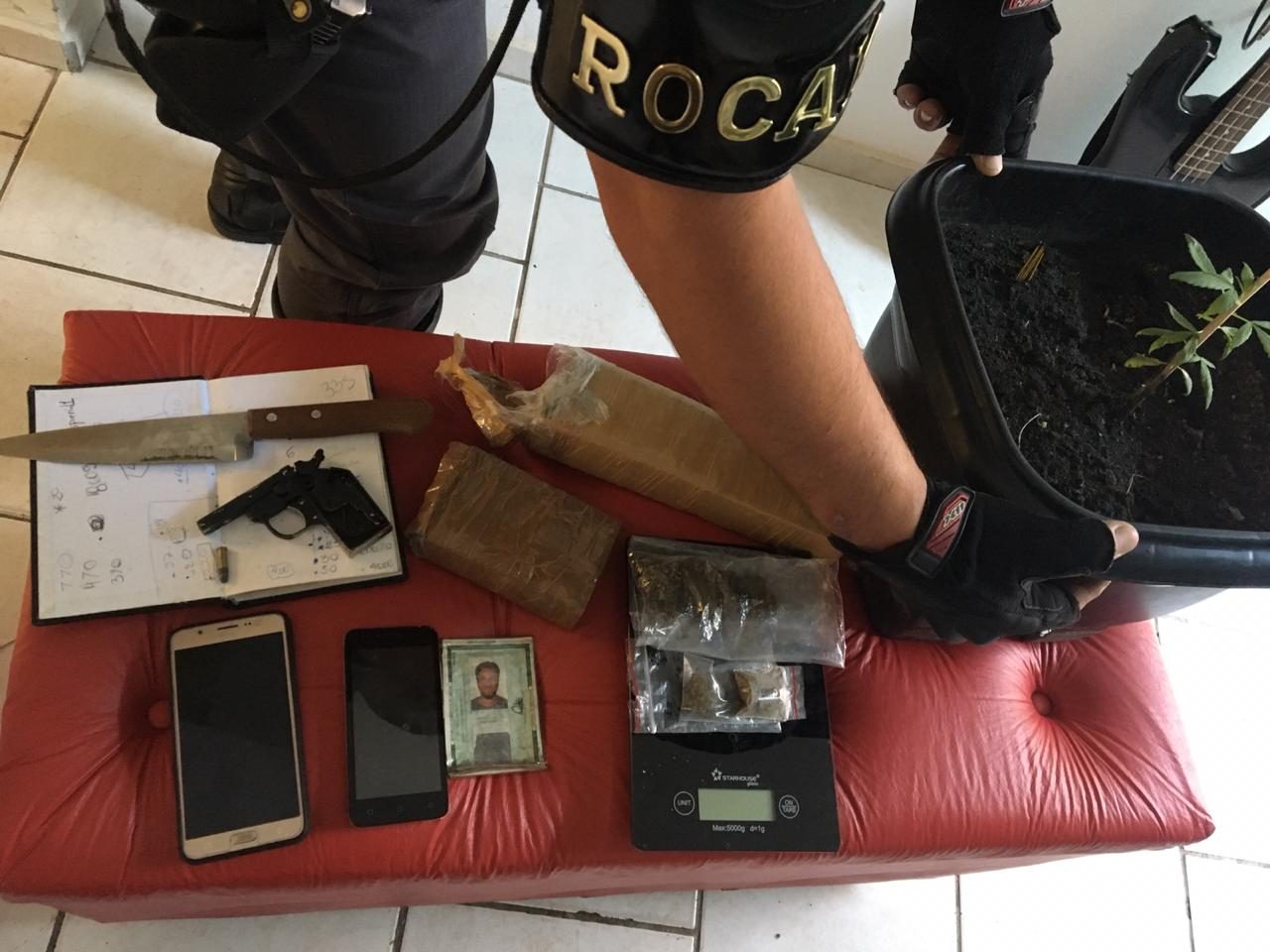 Também foi localizada uma arma de fogo a importância de R$197,00 em cédulas diversas, além de dois aparelhos celulares e caderno de anotações referente ao tráfico. Já na lavanderia estava um vaso com uma planta de maconha.