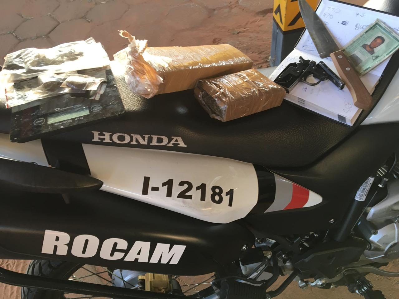 Através da janela foi possível observar uma balança de precisão, uma faca e saquinhos com maconha, o que motivou a entrada na residência. Ao ingressar no imóvel foi encontrada uma bolsa com dois tijolos de maconha em seu interior, diz boletim de ocorrência.