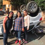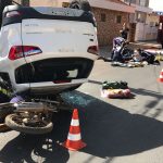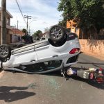 Um acidente envolvendo veículo e moto na João Passos. O carro, um Ford Ecosport branco, capotou violentamente na via, sendo que um dos ocupantes foi arremessado para fora. A motociclista sofreu graves ferimentos e a condutora do veículo ficou presa nas ferragens.