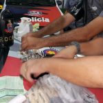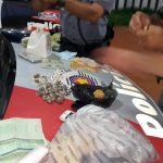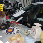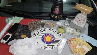 Sua esposa, de 20 anos, também foi abordada e no interior da residência foram localizadas uma pedra bruta de crack, outra de maconha, cocaína e balança de precisão. No quintal havia uma motocicleta e em seu bagageiro foram encontradas mais 46 porções de maconha, 57 de crack e 7 de cocaína, tudo separado para a venda