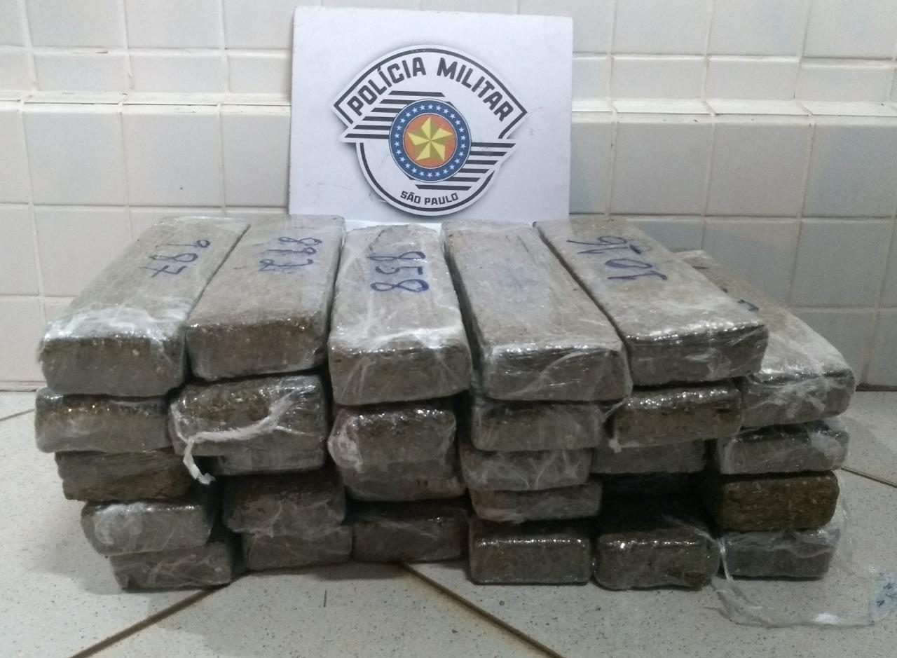 Ao verificarem o porta malas do automóvel, os policiais militares rodoviários do TOR descobriram uma mala oculta por pedaços de papelão e no seu interior localizaram 29 tijolos de maconha que pesaram 27,3 kg.