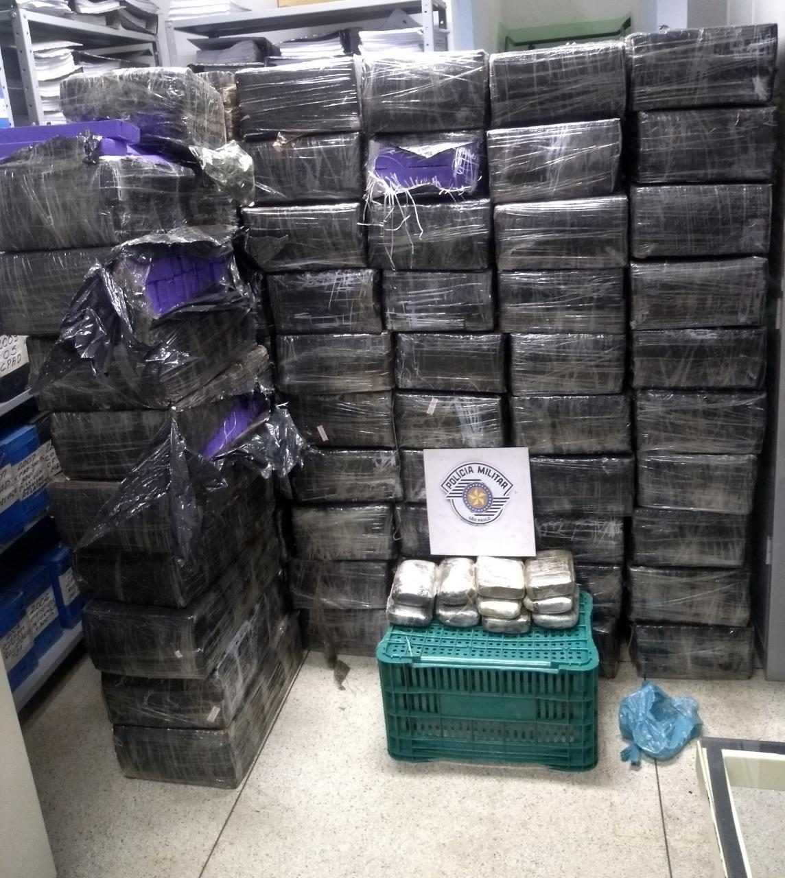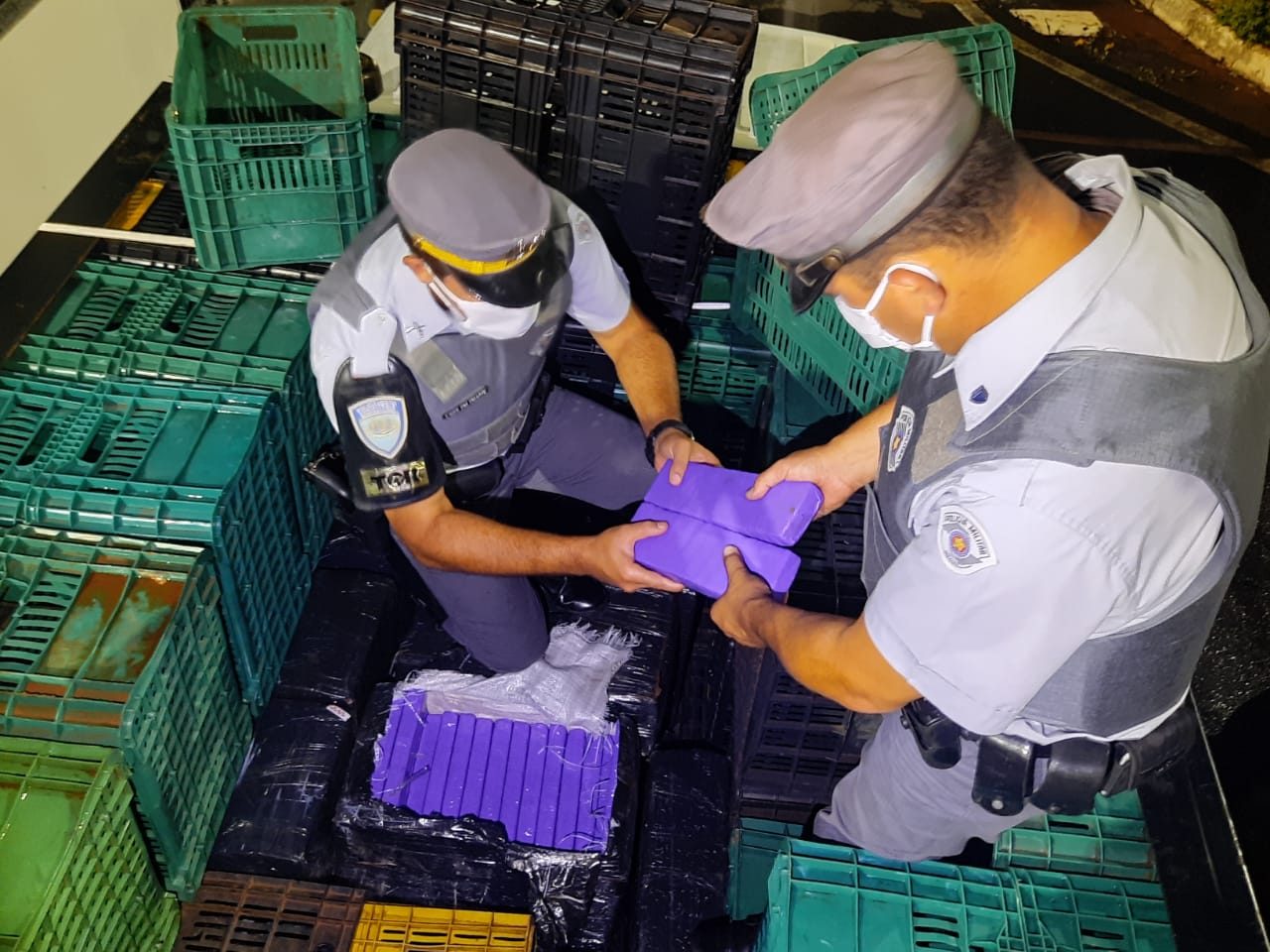 Durante as buscas, foram localizados 60 fardos de maconha e 10 tabletes de Haxixe entre a carga de caixas de frutas/verduras.