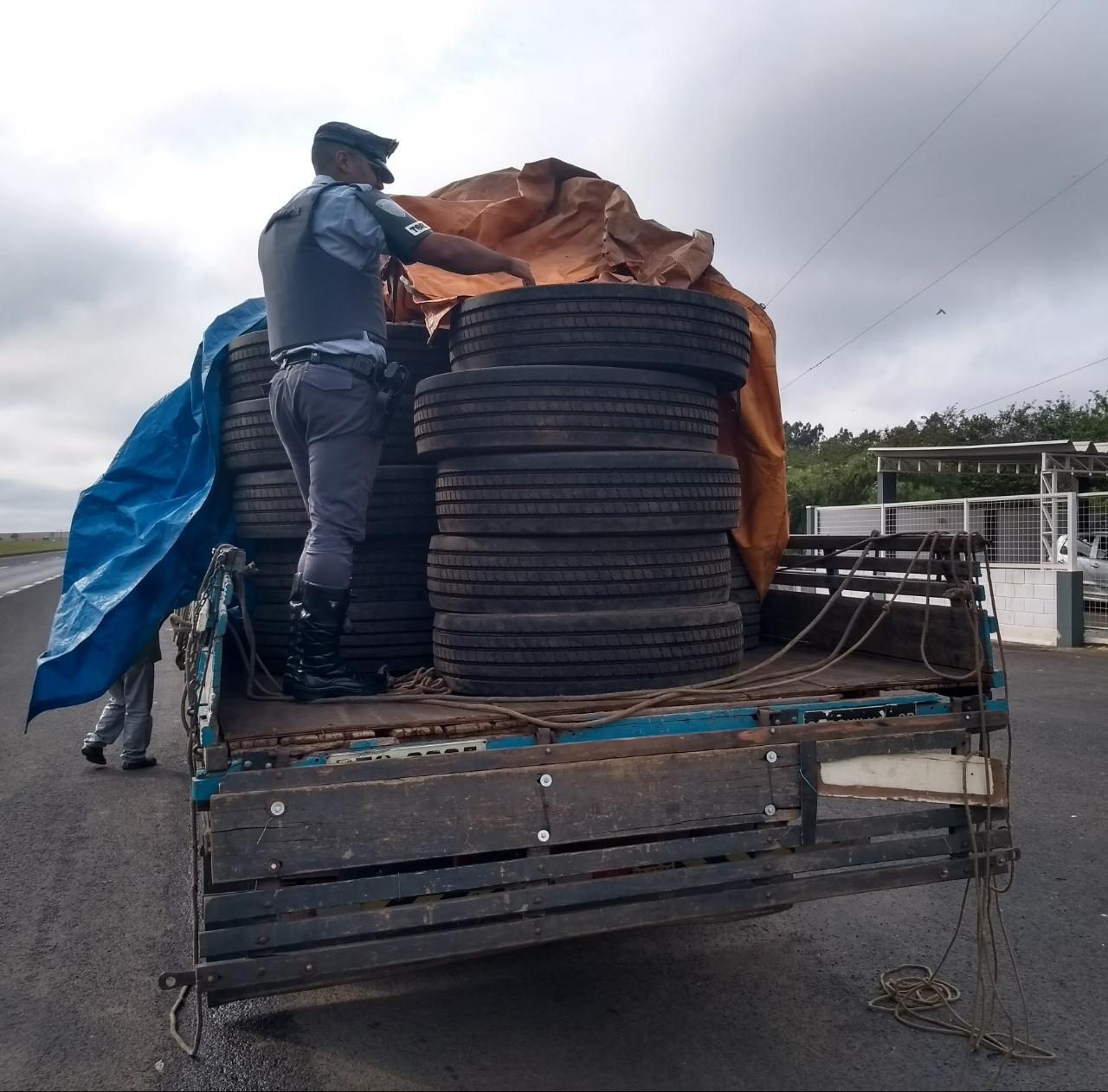 Os policiais militares rodoviários alcançaram o veículo e o abordaram em frente a mesma base operacional, juntamente com o policial militar de serviço no local. O veículo foi vistoriado e no compartimento de cargas do caminhão foram localizados 58 pneus de caminhão novos, fabricados na China, de diversas marcas, porém, o condutor não apresentou documentação que autorizasse a importação ou nota fiscal do transporte que fazia.