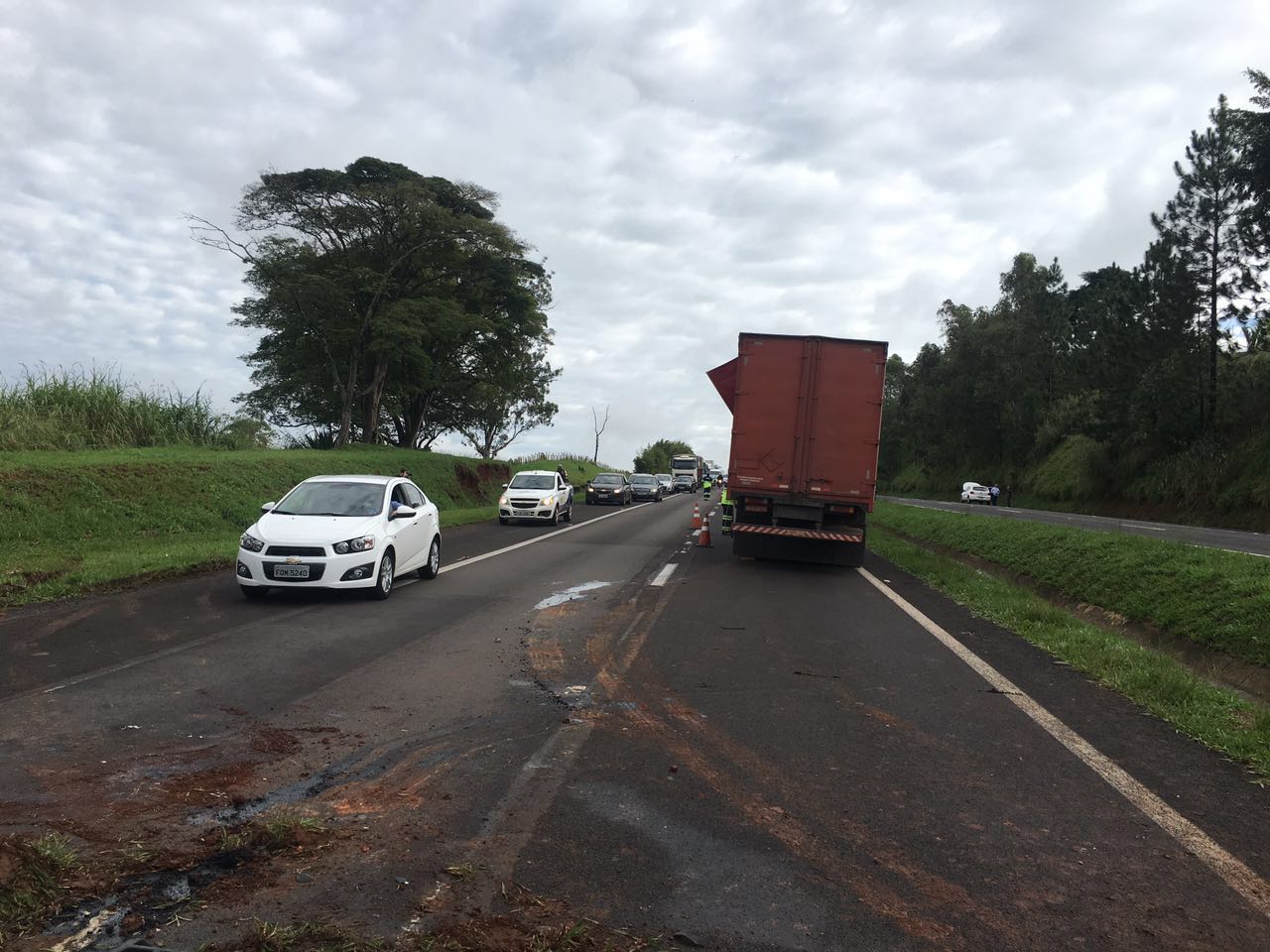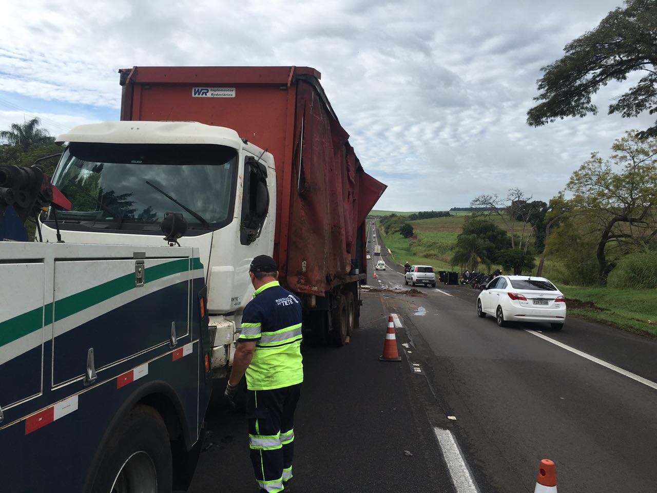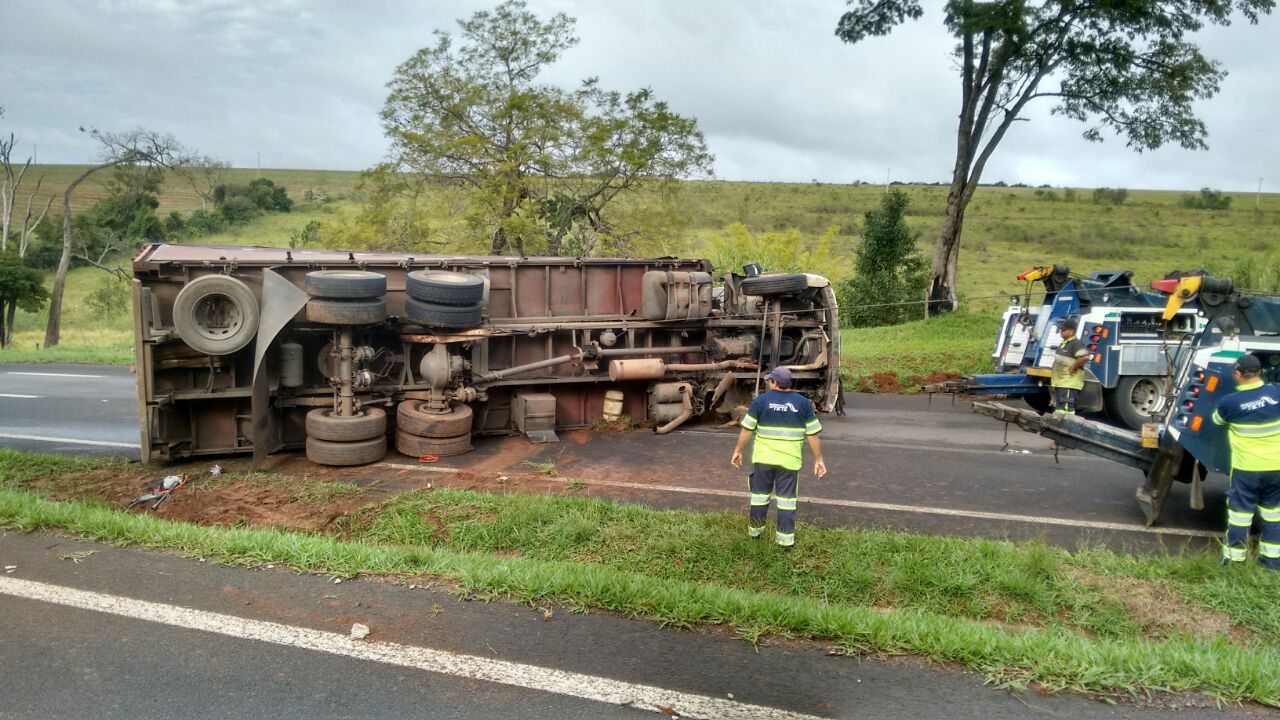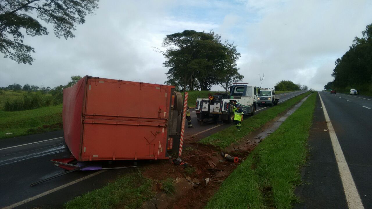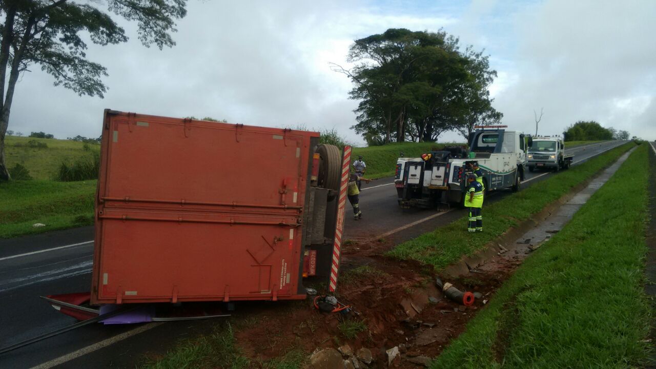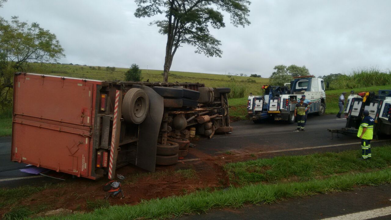 TV Acontece: Caminhão carregado com caixas plásticas tomba e interrompe tráfego na Rondon: Cabo Milanesi/Polícia Rodoviária.