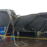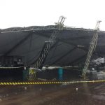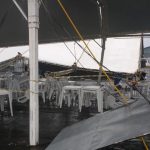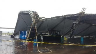 Essa área coberta não chegou a cair totalmente, segundo mostram as imagens, mas ficou muito comprometida, com diversas placas atingindo esse espaço. Trata-se de uma área na frente do palco onde eram realizados os shows do evento, que é particular.