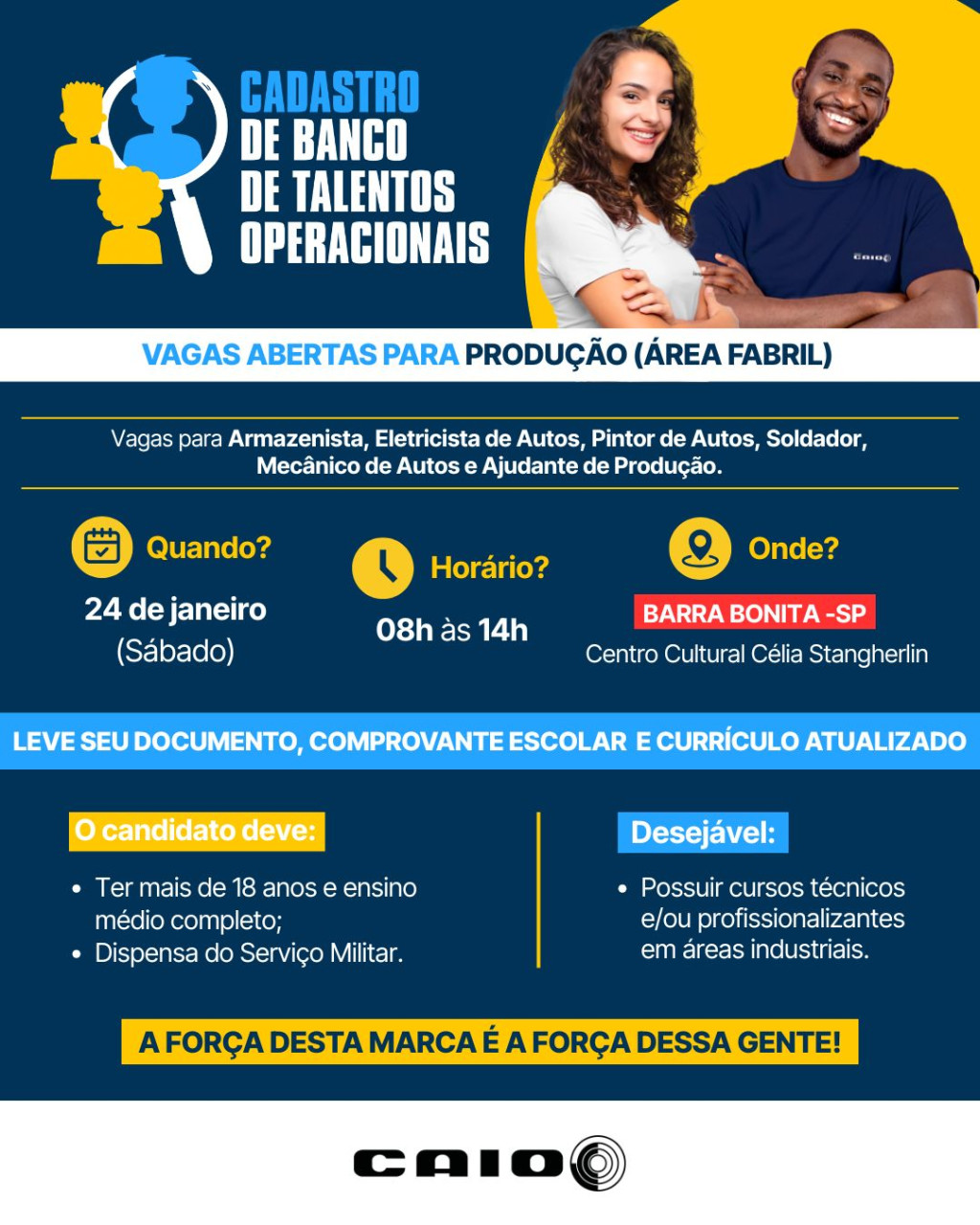 A Caio unidade de Barra Bonita (SP), promove neste sábado, 24 de janeiro, um Feirão de Cadastro de Currículos com oportunidades de trabalho voltadas à área de produção (setor fabril). A ação tem como objetivo reforçar o banco de talentos operacionais da empresa e ampliar as oportunidades de emprego na região.