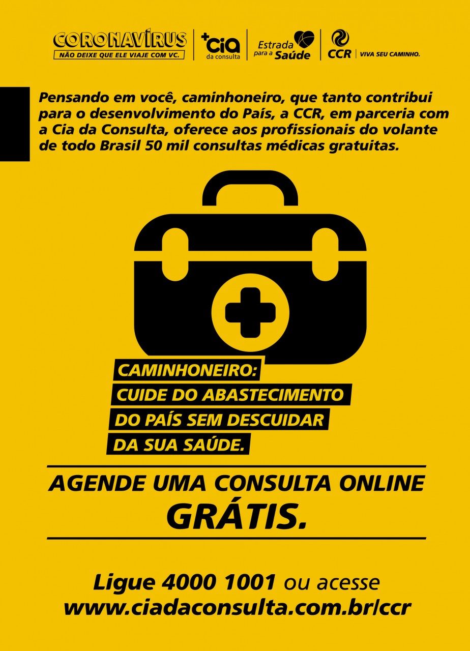 O Grupo CCR, do qual a CCR SPVias faz parte, vai disponibilizar para caminhoneiros, de todo o país, 50 mil consultas médicas online gratuitas, via chamada de vídeo, para atendimentos com foco na COVID-19. O serviço pode já pode agendado e estará disponível até julho.