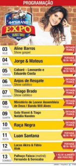 Até o dia 13 de agosto, grandes nomes da música vão agitar as noites da Grand Expo (veja mais no quadro ao lado). Hoje, inclusive, já tem show com entrada gratuita. A cantora gospel Aline Barros, sucesso nacional e internacional, solta a voz a partir das 22h.