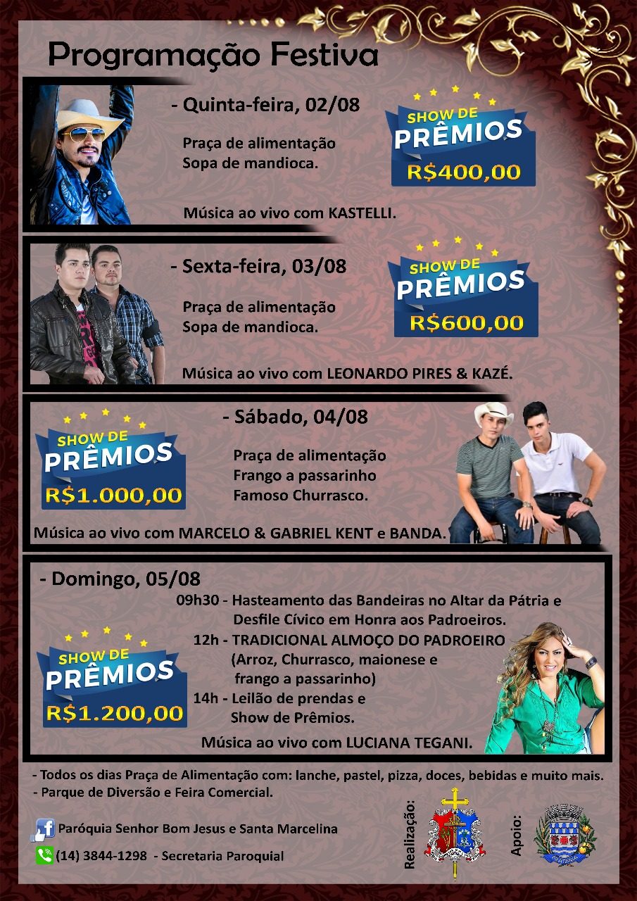 20h – SHOW DE PRÊMIOS: R$ 1.200,00