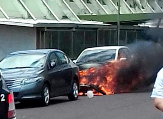 Assim que começou a colocar a gasolina no tanque, um fio de incêndio que teve início no motor se alastrou rapidamente, atingindo a parte da frente do carro.