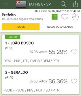 Após 9 meses Itatinga conhece seu Prefeito. Em uma disputa acirrada, após um período eleitoral mais curto, o município foi às urnas mais uma vez. Os pouco mais de 14 mil eleitores de Itatinga votaram e João Bosco foi eleito como novo prefeito, sendo Lineu Barnabé o seu vice.