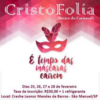 Organizado pelo Setor Juventude e pelos grupos de jovens de São Manuel, será realizado nos dias 25 a 28 de fevereiro, mais um Retiro de Carnaval. O evento contará com momentos de oração, pregações, louvor, além de brincadeiras e festas temáticas durante os 4 dias.