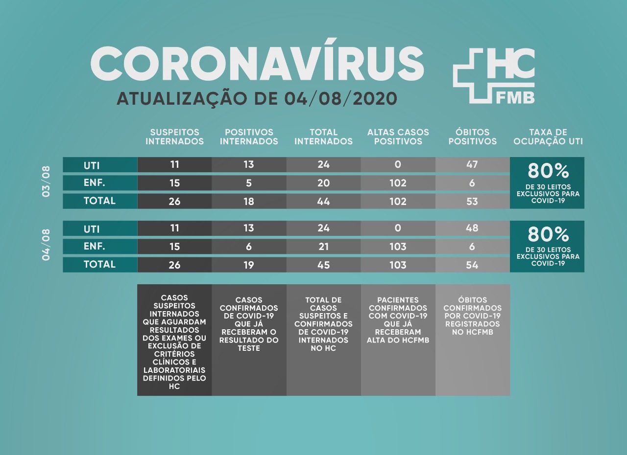 O HCFMB contabiliza o total de 54 óbitos por COVID-19, sendo: