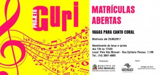 Até o dia 25 de agosto, o Projeto Guri está com inscrições abertas para o curso de Canto Coral para crianças e adolescentes de 7 a 17 anos. As aulas são totalmente gratuitas e realizadas no período da tarde.
