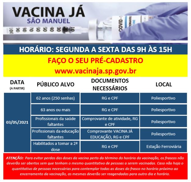 A Diretoria de Saúde de São Manuel dá continuidade a vacinação contra a Covid-19 nesta segunda-feira (3). Recebem a primeira dose os idosos a partir de 62 anos. A cidade recebeu 250 doses para essa imunização que será em sistema drive-thru no Ginásio Poliesportivo, das 9 às 15h.