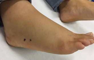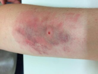 “Nesse caso a paciente chegou se queixando de dor e formigamento. Durante a manhã, ela notou essa mancha central, além de sudorese, náuseas, boca seca e urina amarronzada”, disse Dr. Alexandre. “Como a picada da aranha-marrom é indolor, a vítima só vai perceber mais tarde mesmo”.