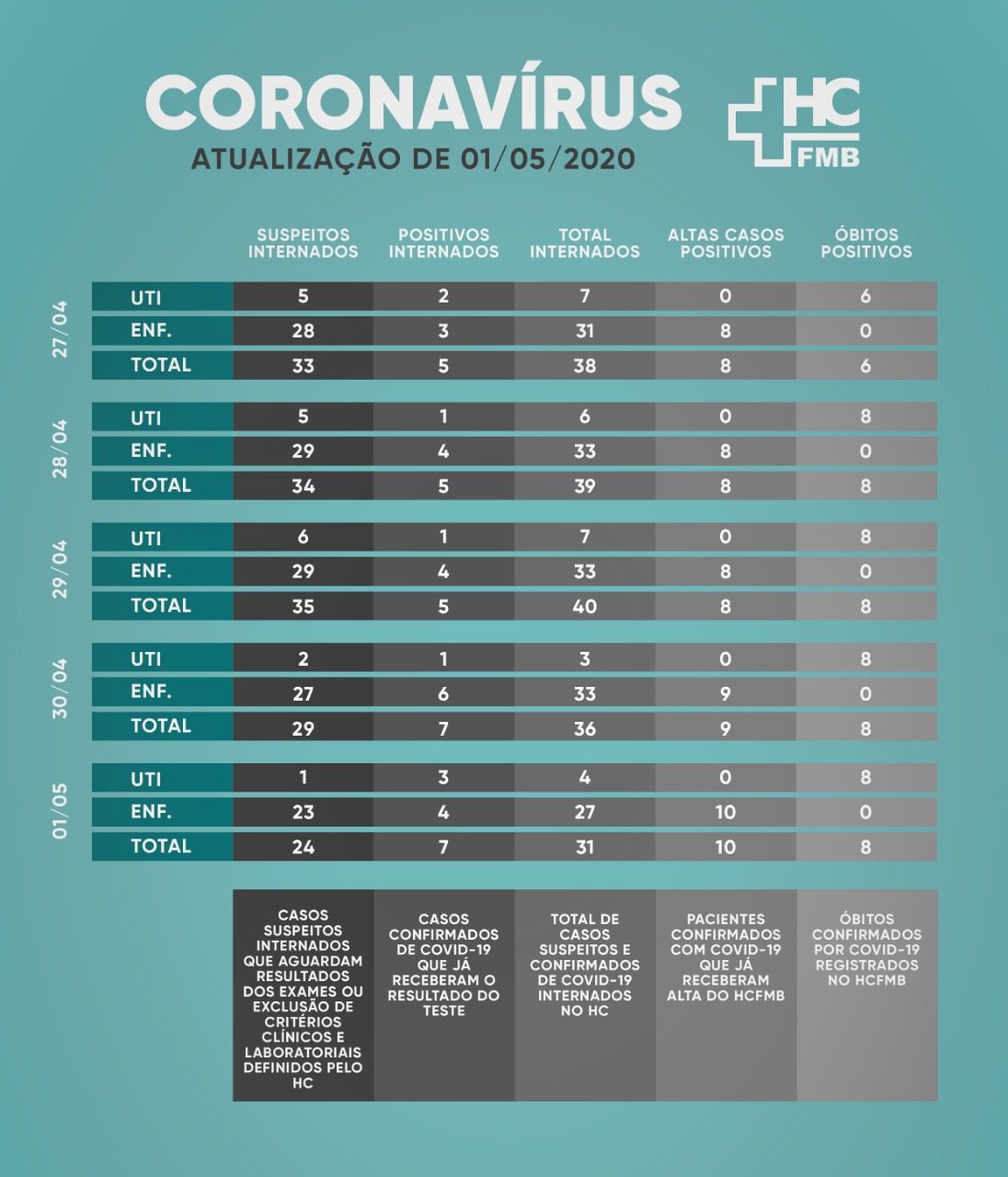 Segue abaixo tabela atualizada com número de pacientes internados (casos suspeitos e confirmados) em enfermarias e UTI do HC, além das altas e óbitos confirmados.