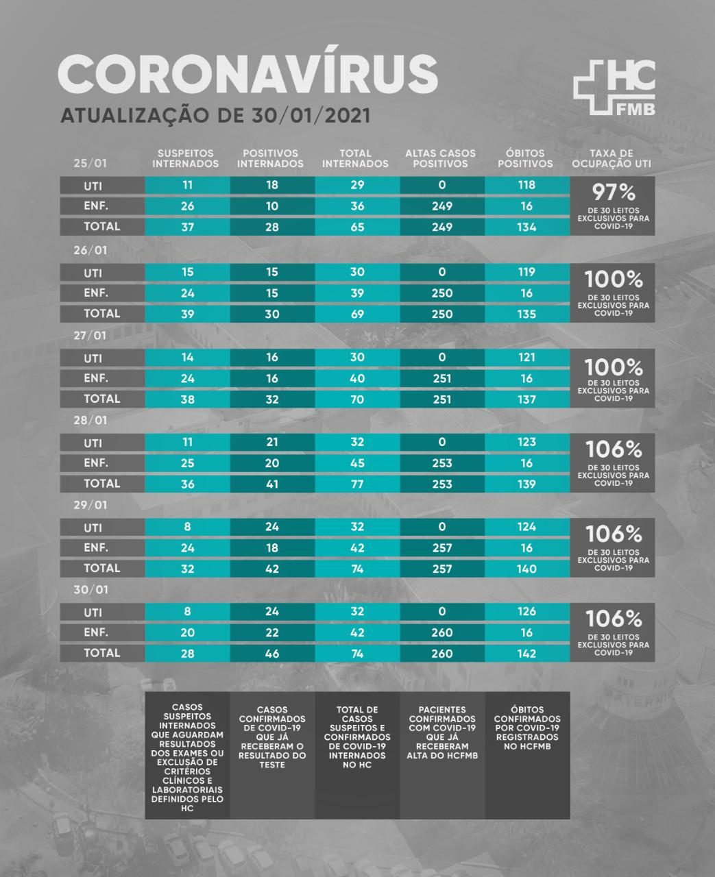 O Hospital das Clínicas da Faculdade de Medicina de Botucatu (HCFMB) atualizou neste sábado, dia 30, suas principais informações referentes à COVID-19.