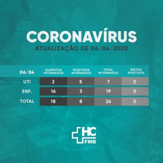-O HCFMB tem 08 casos positivos de COVID-19 internados, sendo 5 em UTI e 3 em enfermarias.
