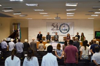 O chefe do Departamento, professor Marcos Minicucci, falou sobre a importância da FMB no cenário nacional lembrando do recorde de candidatos por vaga do vestibular 2018 (312,7) e da grandeza do Departamento de Clínica Médica em toda Unesp. “Eu acredito que numa festa de aniversário nós devemos lembrar e celebrar o passado, devemos viver intensamente o presente e refletir sobre o futuro”, disse. “Nos orgulhamos de formar médicos e residentes que se destacam não só pela competência técnica, mas também pela formação humana e pela empatia”, complementou.