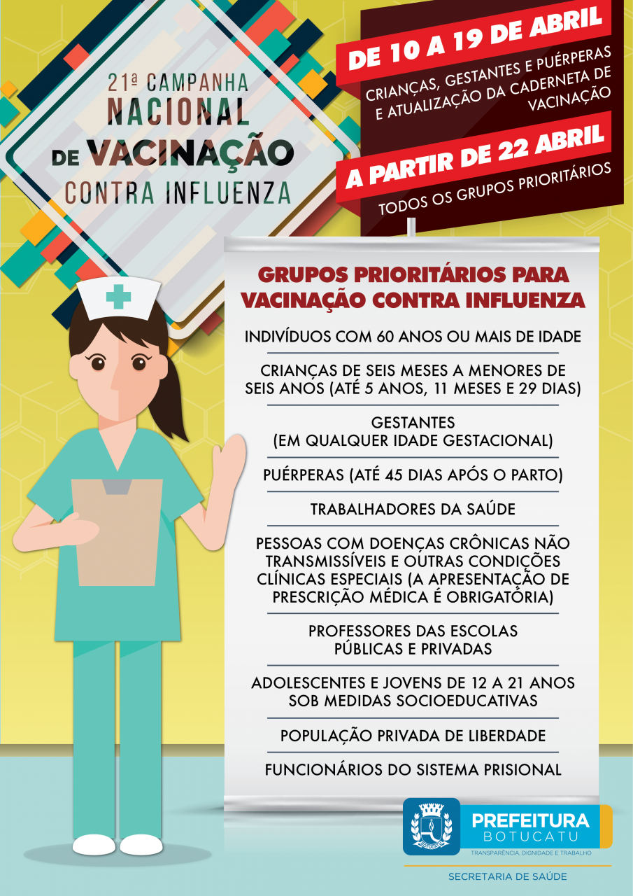 A vacina é contraindicada para pessoas com história de reação anafilática prévia em doses anteriores, bem como a qualquer componente da vacina. Em Botucatu todas as Unidades de Saúde estarão vacinando o público alvo da Campanha, em seus horários convencionais de atendimento.