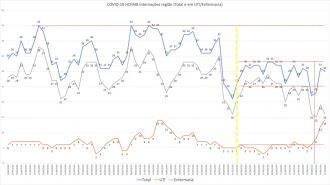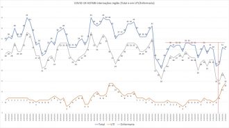 O gráfico abaixo mostra o total de internações no HC, incluindo pacientes de toda região. As linhas em destaque na horizontal mostram que não houve aumento no total de pacientes da região internados no HC. Já a linha em vermelho na vertical mostra a abertura dos 30 leitos.
