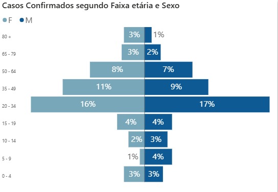 Entre crianças e idosos, os registros aparecem em proporções menores. As faixas de 0 a 9 anos e acima de 65 anos apresentam participação reduzida no total de casos confirmados, enquanto adolescentes entre 15 e 19 anos surgem com índices intermediários, abaixo dos adultos jovens.
