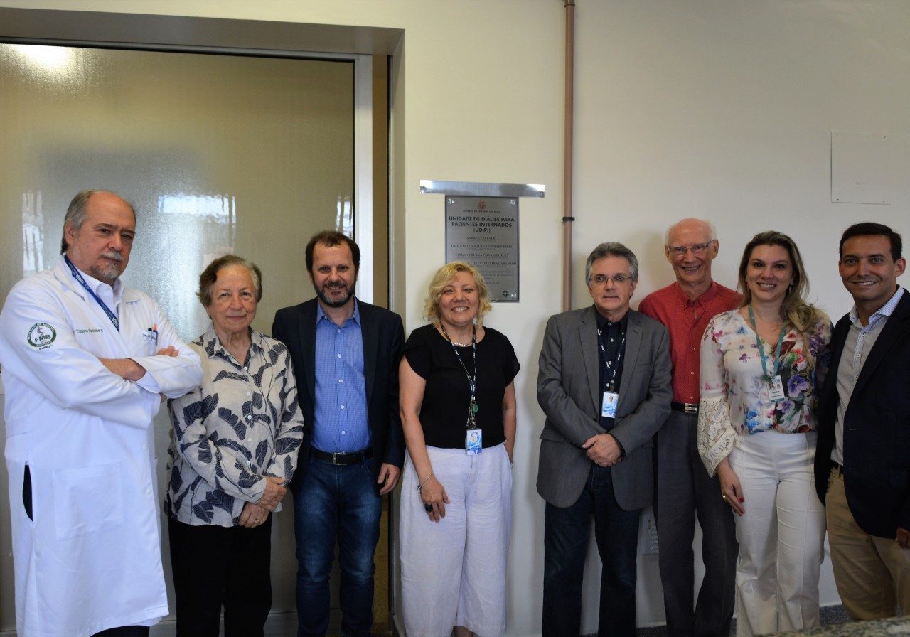 Após as palavras da diretora de Assistência, Dra. Erika Ortolan; do chefe do Depto. de Clínica Médica, Dr. Marcos Ferreira Minicucci; da chefe do serviço de Diálise, Dra. Jacqueline Costa Teixeira Caramori e da Profa. Emérita da FMB, Dinah Borges de Almeida, foi realizado o descerramento da placa da UDiPI, inaugurando oficialmente o novo espaço para o atendimento de pacientes internados.