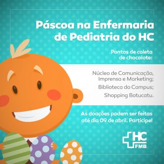 O Hospital das Clínicas da Faculdade de Medicina de Botucatu (HCFMB) lança nessa semana a Campanha “Páscoa na Pediatria”. A ação, que tem o intuito de fazer a Páscoa das crianças internadas na Enfermaria de Pediatria do Hospital mais doce e feliz, arrecadará chocolates para presenteá-las no feriado, e proporcionar momentos de alegria entre elas e seus familiares.