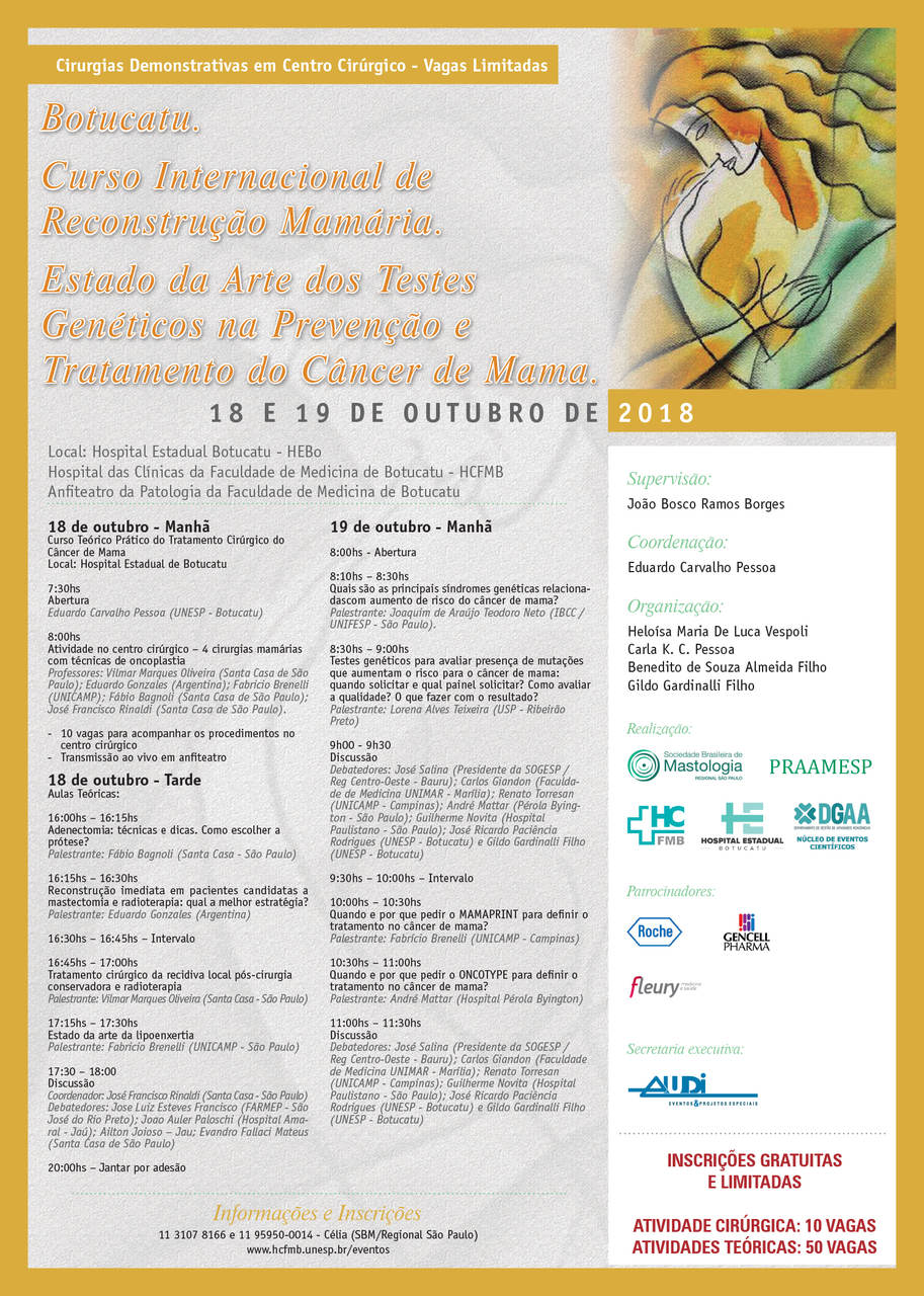 Nos dias 18 e 19 de outubro, o HCFMB e o Centro de Avaliação em Mastologia (CAM) “Prof. Emérito Laurival A. De Luca” sediarão o Curso Internacional de Reconstrução Mamária – Estado da Arte dos Testes Genéticos na Prevenção e Tratamento do Câncer de Mama abrangendo, como público-alvo, mastologistas e pós-graduandos em Ginecologia / Obstetrícia, em Mastologia e em Cirurgia.