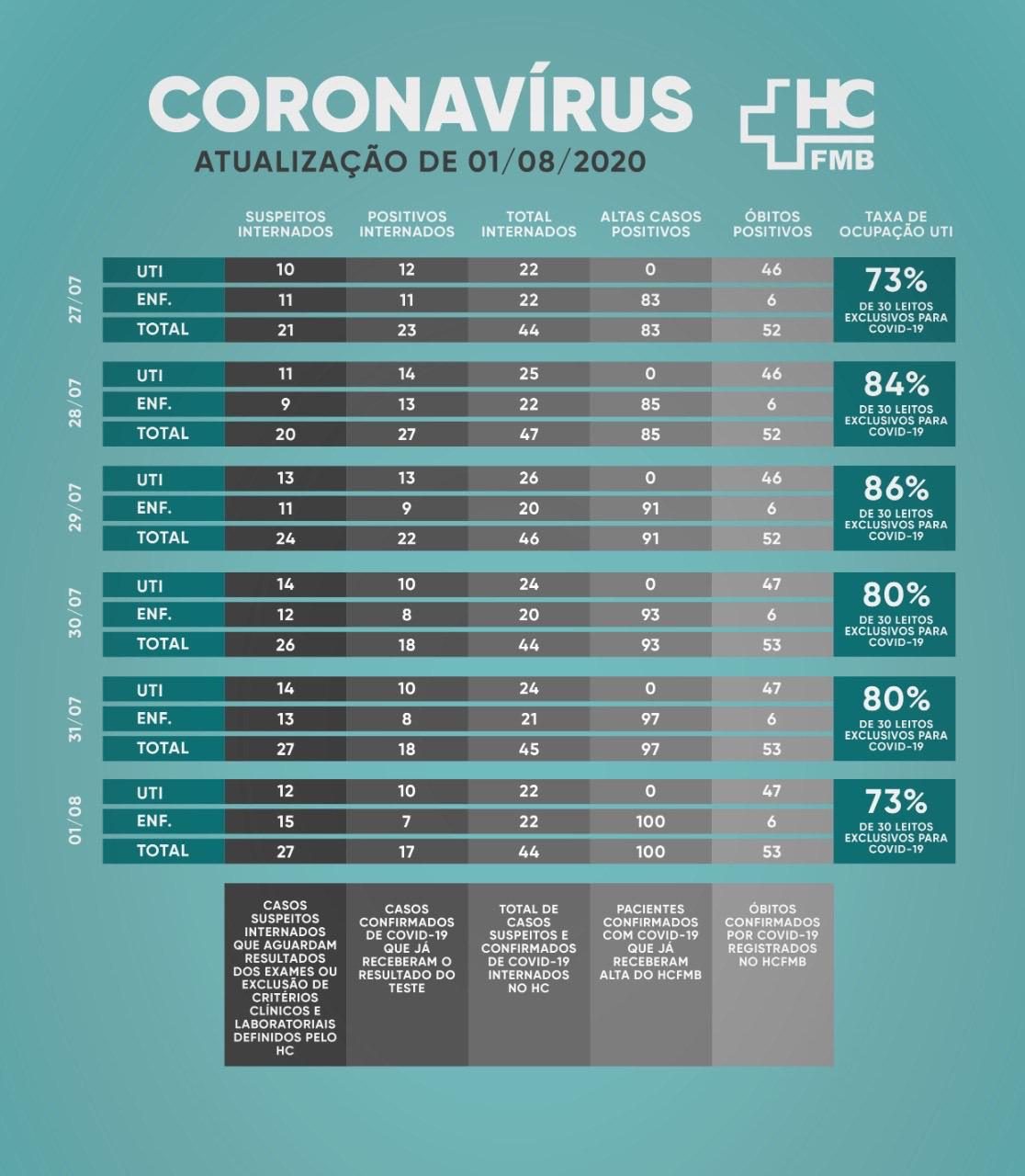 Segue abaixo tabela atualizada com número de pacientes internados (casos suspeitos e confirmados) em enfermarias e UTI do HC, além das altas e óbitos confirmados.