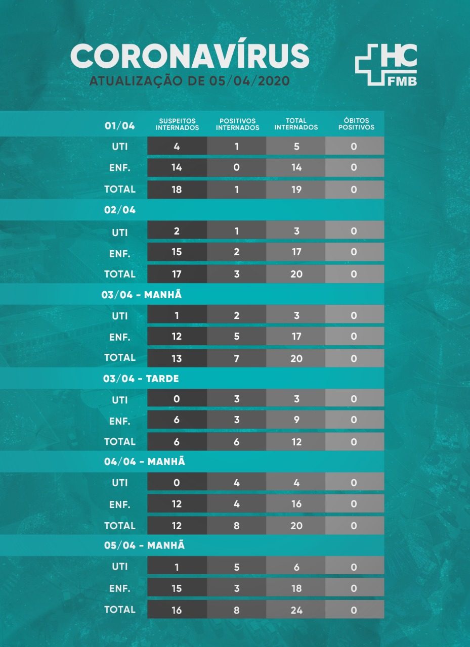 O boletim mostra que aumentou o número de pacientes internados na UTI, somando 5 pessoas. São 3 pacientes internados na enfermaria do Hospital. Esses são apenas números do HCFMB, não o total na cidade.