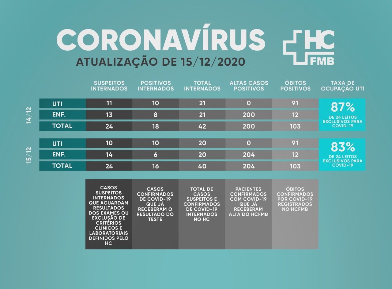 O Hospital das Clínicas da Faculdade de Medicina de Botucatu (HCFMB) atualizou nesta terça-feira, dia 15, suas principais informações referentes à COVID-19 desta terça-feira, 15 de dezembro.