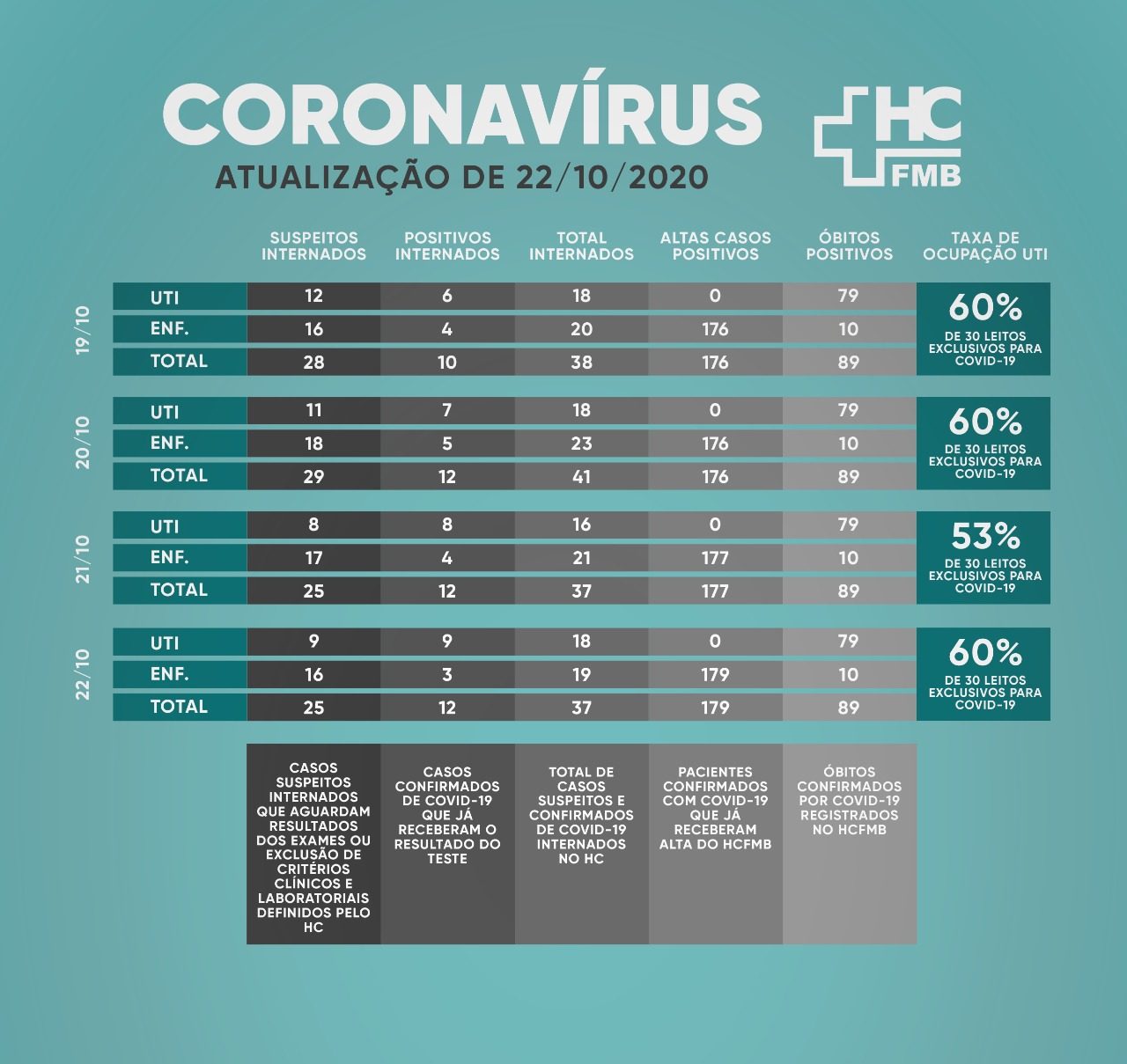 O Hospital das Clínicas da Faculdade de Medicina de Botucatu (HCFMB) atualizou nesta quinta-feira, dia 22, suas principais informações referentes a COVID-19.
