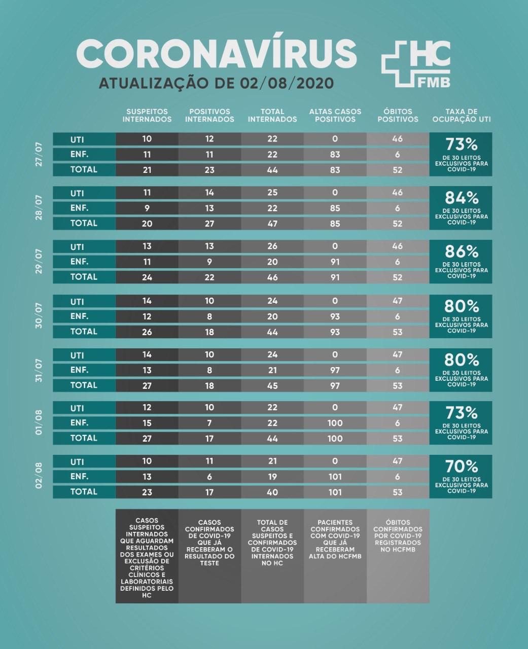 O Hospital das Clínicas da Faculdade de Medicina de Botucatu (HCFMB) atualizou neste domingo suas principais informações sobre a covid-19.