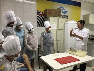O estudante de gastronomia Gabriel Galante, 30, prepara a cozinha para mais uma aula aos pacientes do Serviço de Atenção e Referência em Álcool e Drogas (SARAD). Os pacientes se vestem adequadamente e olham encantados para a mesa, que já conta com os ingredientes e equipamentos de cozinha que serão usados na aula.