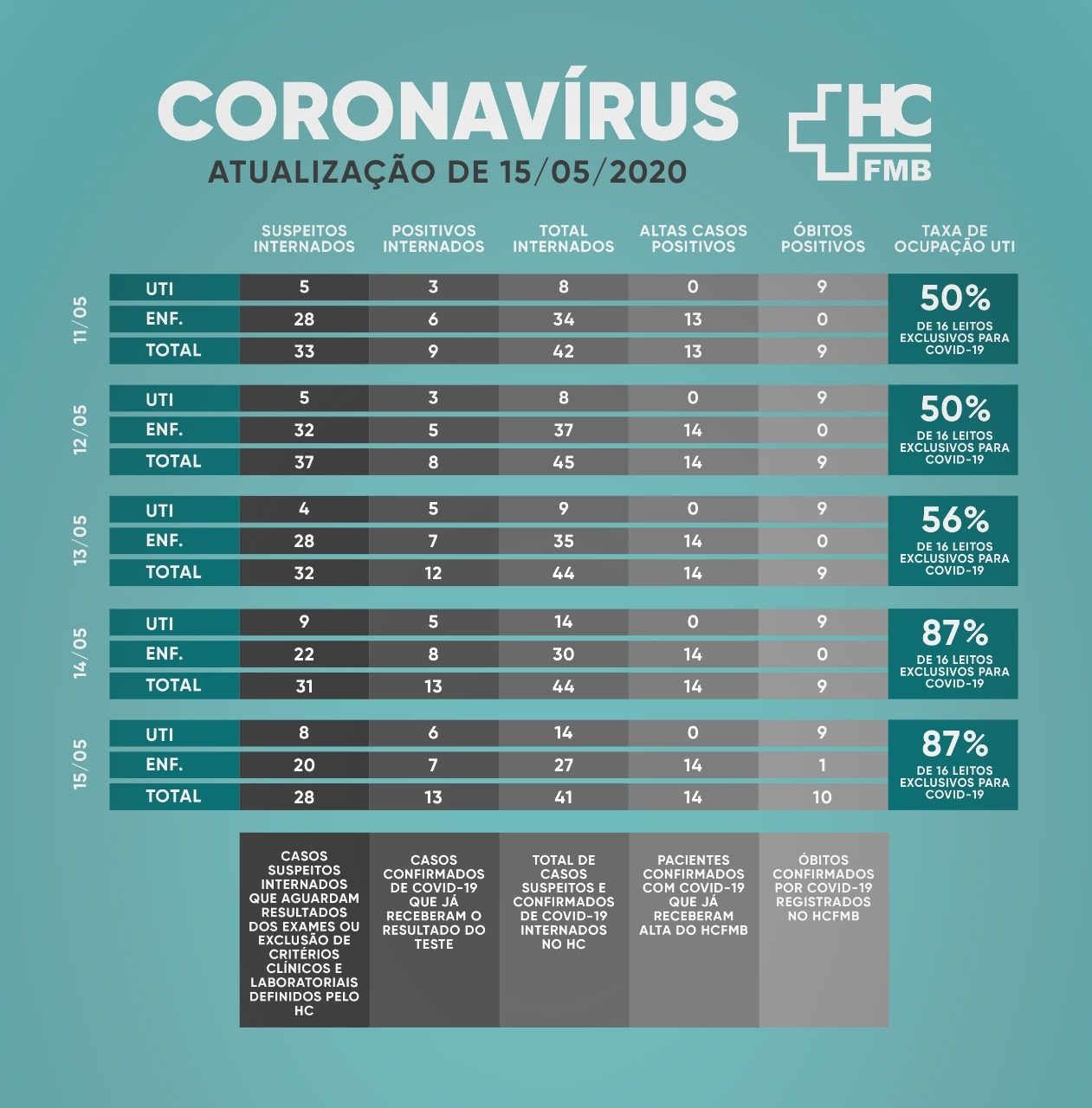 Frente ao seu compromisso com a transparência nas informações prestadas, o HCFMB atualiza suas informações oficiais de hoje, 15 de maio: