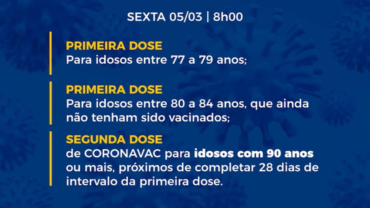 Também nesta sexta-feira, haverá a aplicação da segunda dose da Coronavac para idosos com 90 anos ou mais. A imunização ocorrerá naqueles que estão próximos de completar 28 dias de intervalo da primeira aplicação.