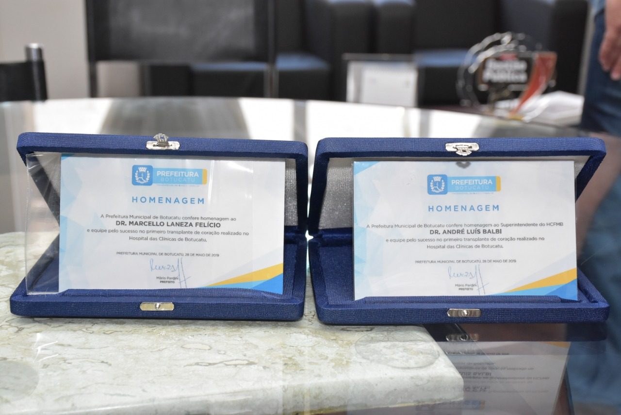 Os Doutores Marcello Laneza Felício, cardiologista chefe do procedimento, e André Balbi, Superintendente do HC, receberam do prefeito uma placa, como forma de homenagear e reconhecer o belíssimo trabalho prestado por eles.