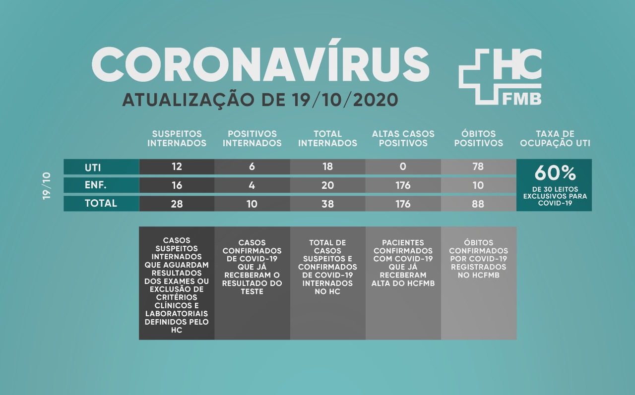 O Hospital das Clínicas da Faculdade de Medicina de Botucatu (HCFMB) atualizou nesta segunda-feira, dia 19, suas principais informações referentes a COVID-19.
