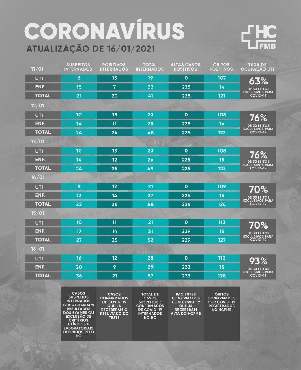 O Hospital das Clínicas da Faculdade de Medicina de Botucatu (HCFMB) atualizou neste sábado, dia 16, suas principais informações referentes à COVID-19 deste sábado, 16 de janeiro de 2021.