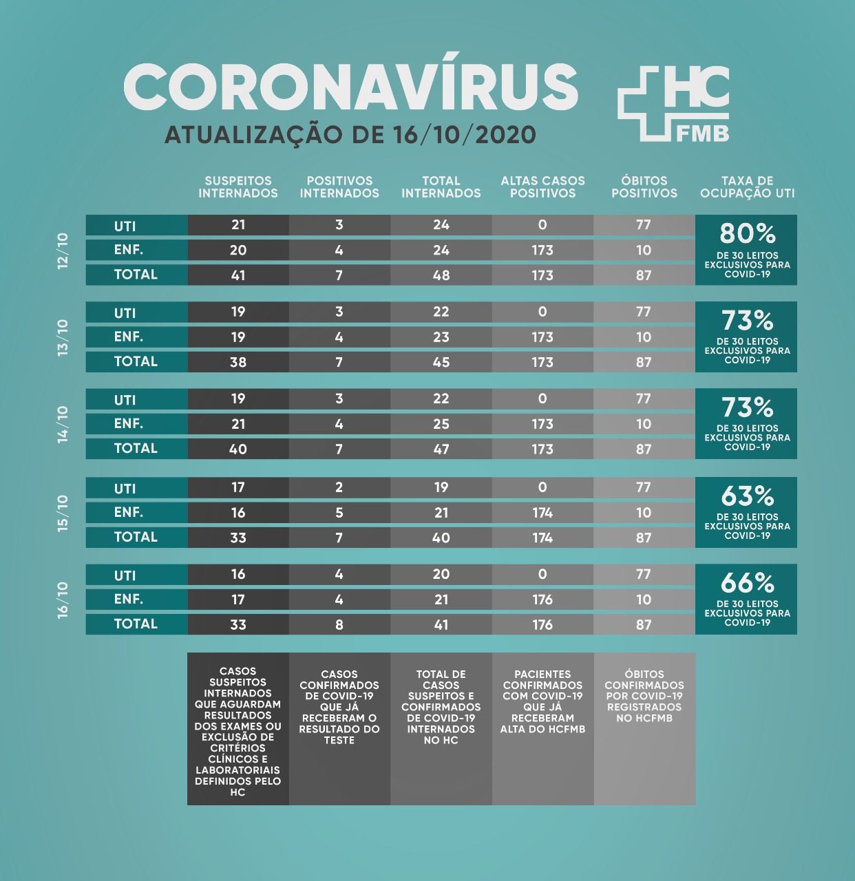 O Hospital das Clínicas da Faculdade de Medicina de Botucatu (HCFMB) atualizou nesta sexta-feira, dia 16, suas principais informações referentes a COVID-19 outubro.