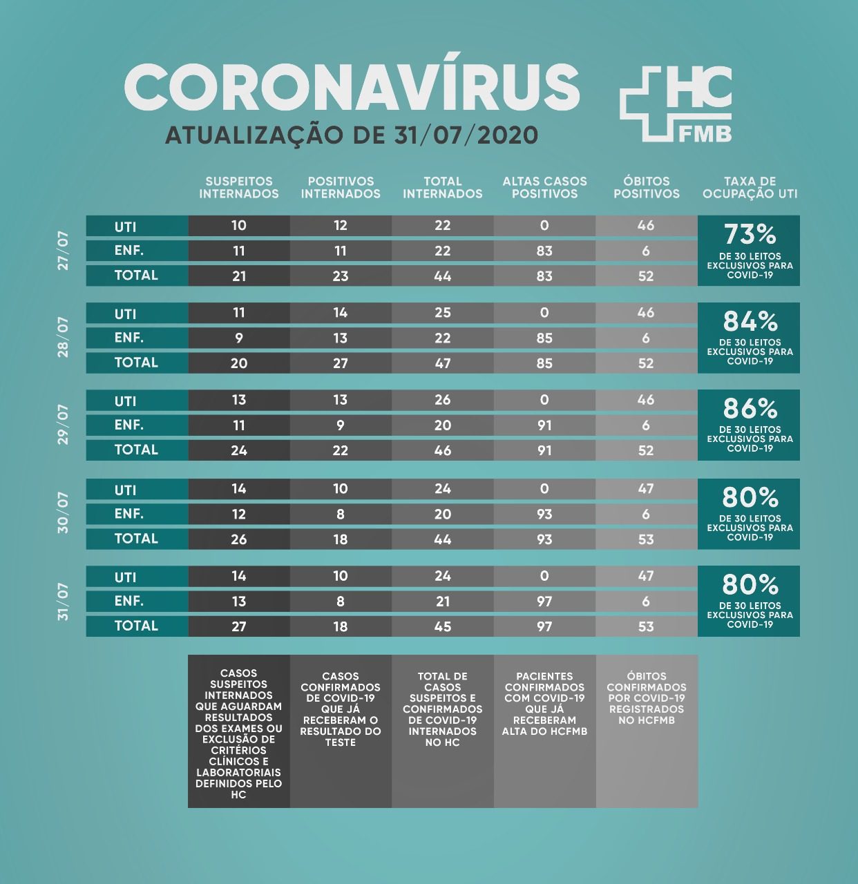 No dia 29 de julho foi registrado um óbito de paciente com diagnóstico confirmado de COVID-19 no HCFMB. Trata-se de uma mulher de 76 anos, moradora de Botucatu, internada em UTI COVID desde 24 de julho.