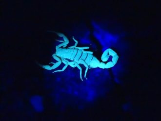 Quando são iluminados pelos raios ultravioletas de uma luz negra, os escorpiões adquirem uma cor azul brilhante. Isso acontece, pois, os raios que atingem os escorpiões são convertidos pelas proteínas de seus exoesqueletos em luz.